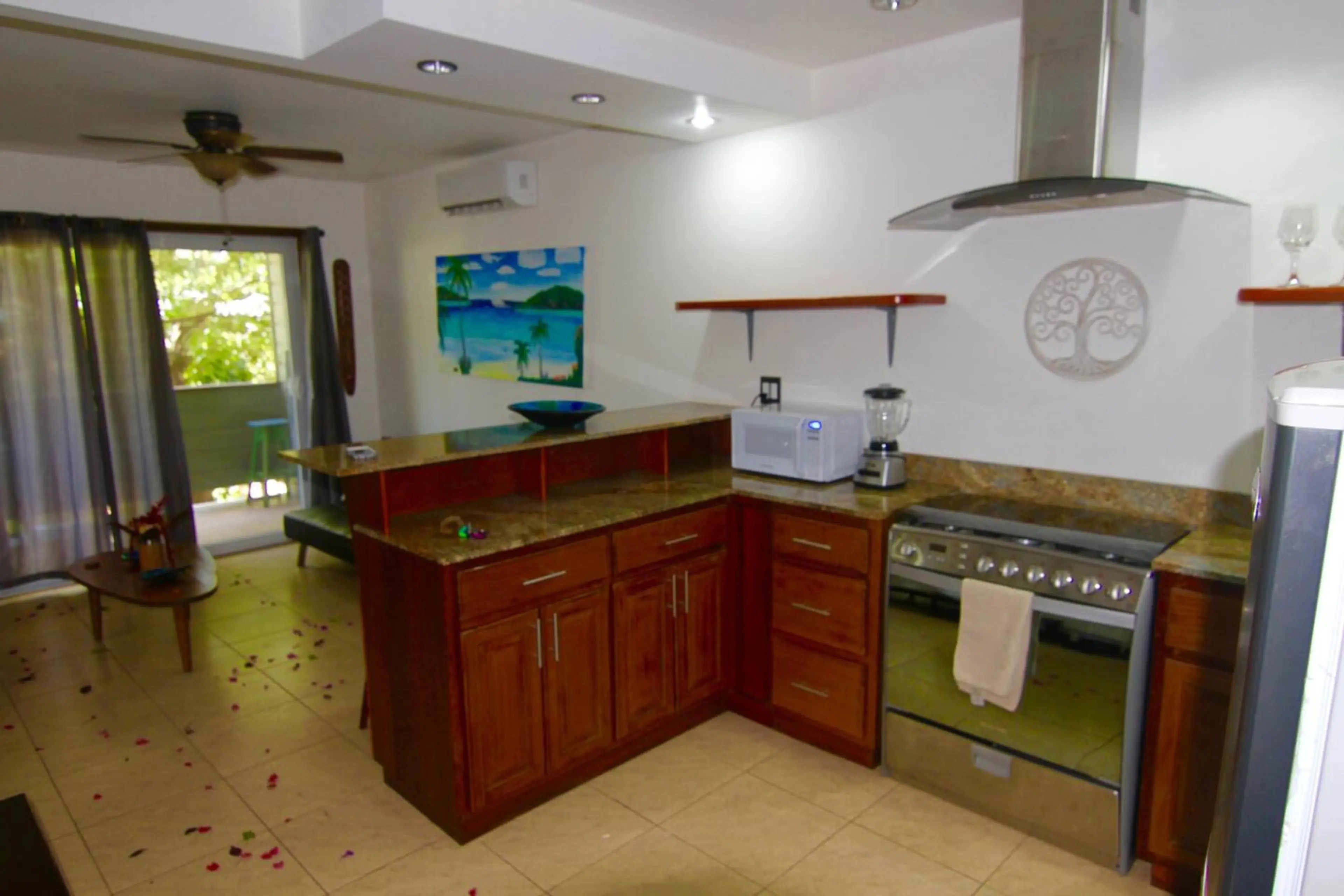 Full Kitchen, full bathroom, hot water, queen bed and futon in living room. balcony. Free Wifi, Free parking. 80 feet from the beach, Garden view.